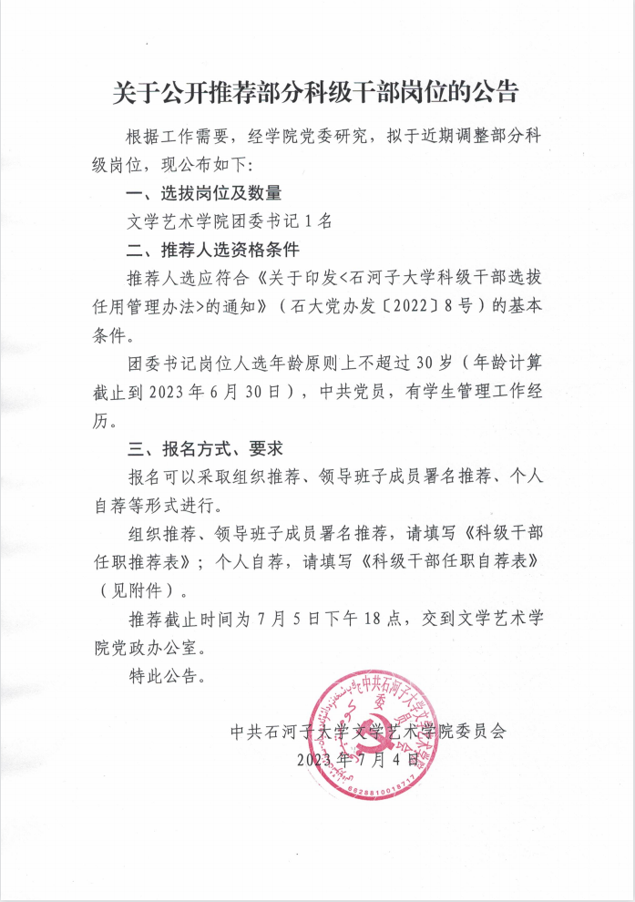 关于公开推荐部分科级干部岗位的公告
