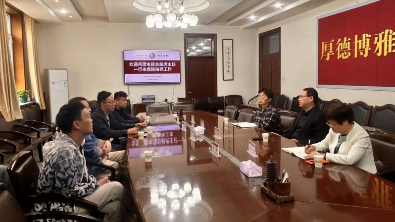 4月25日下午,兵团广播电视台纪录片中心主任赵虎率领《国家使命》剧组来到beat365在线唯一官网,进行援疆干部奉献兵团建设的事迹调研、与学院部分老师座谈,并参观了学院新疆非物质文化遗产研究中心。学院院长杨向奎、副院长嵇美云、新闻与传媒系书记高山参与了此次交流。