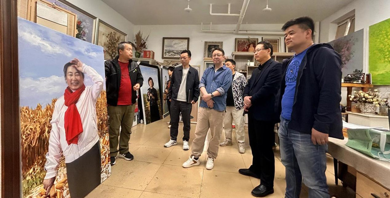 调研期间,摄制组对刘洪老师“兵团先进人物”系列油画创作工作非常感兴趣。赵虎认为这项工作在展示兵团人精神风貌方面意义重大,并与刘洪老师达成拍摄其创作过程的意向。