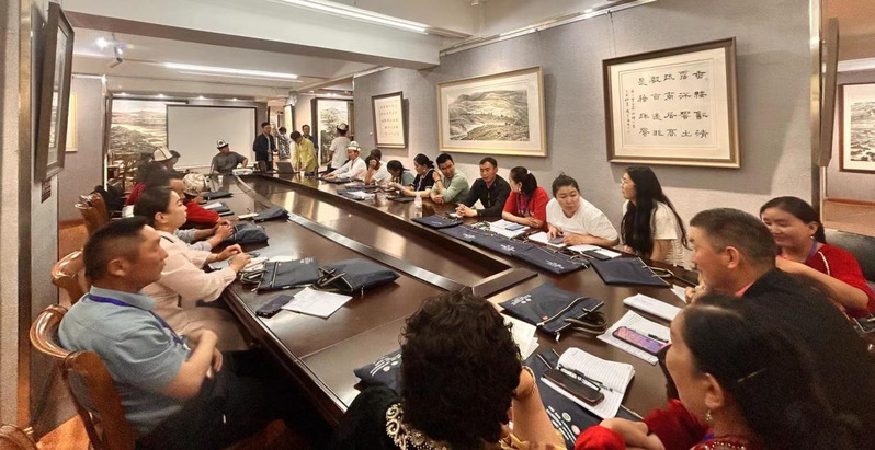 随后,摄制组一行在杨院长陪同下,参观了学院的新疆非物质文化遗产研究中心,了解非遗中心在教学、科研、文化传承与社会服务领域发挥的功能与作用。摄制组一行还走进非遗中心正在举办的“玛纳斯说唱研培”教学课堂,观摩学院教师为本期学员开展的国语学习培训的授课艺术。