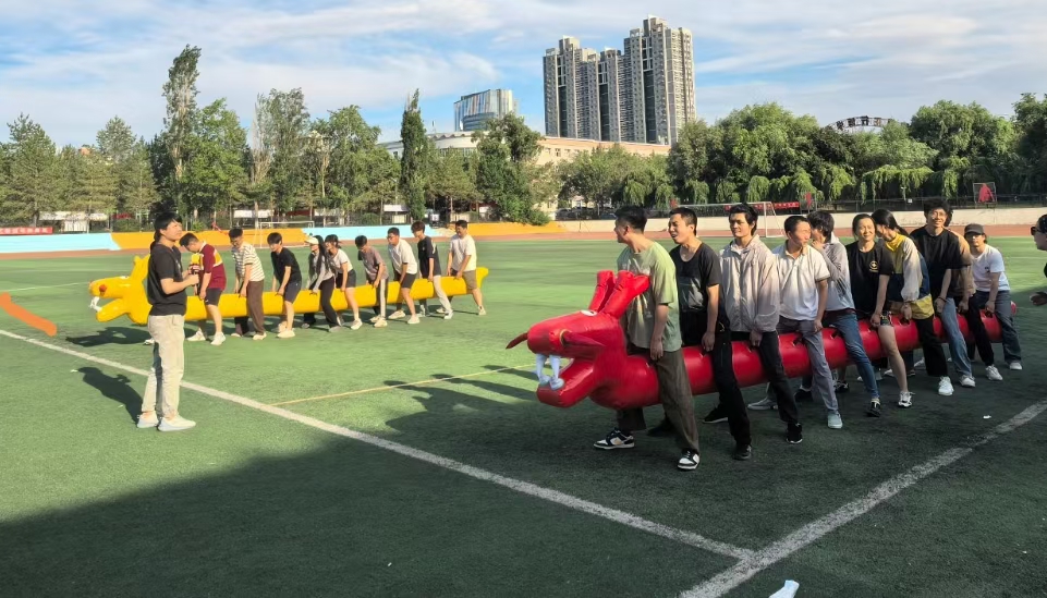 操场中,在旱地龙舟和拔河比赛沉浸式体验环节,6支队伍进行了激烈比拼,伴随着整齐的口号,队员之间默契配合,奋勇向前,笑声、加油声、欢呼声充斥着整个操场。