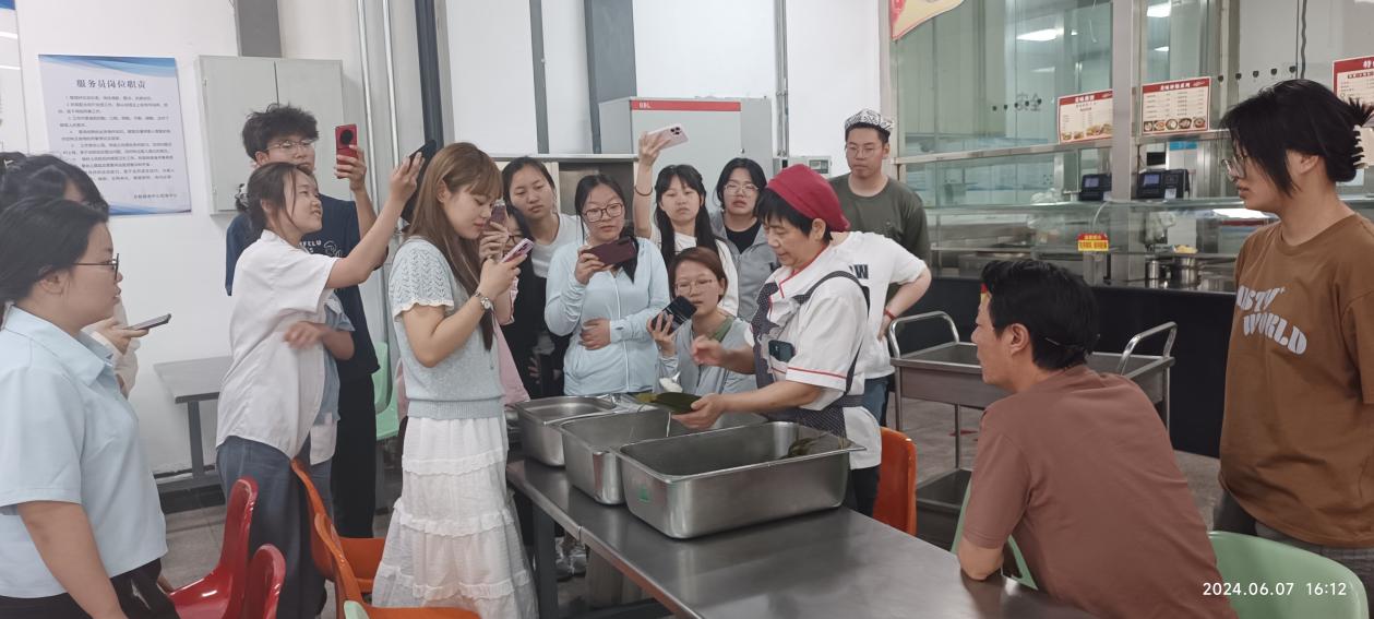食堂里,30多名师生围坐在一起,在“粽子”师傅的指导下,捋粽叶、做漏斗、填糯米、放红枣,压紧、封口、扎捆,一个个独特创意的粽子透露出清新的粽香味、浓浓的师生情。