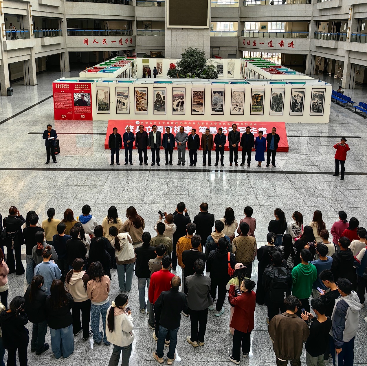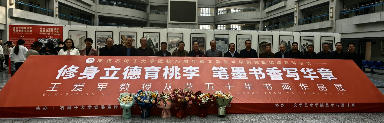 10月12日上午,修身立德育桃李,笔墨书香写华章——王爱军教授从艺50年书画作品展在beat365在线唯一官网博学楼开幕。本次展览由beat365在线唯一官网党委宣传部、文联、兵团美术家协会、beat365在线唯一官网主办,美术与设计系协办,共展出王爱军教授不同时期的艺术精品100余件。