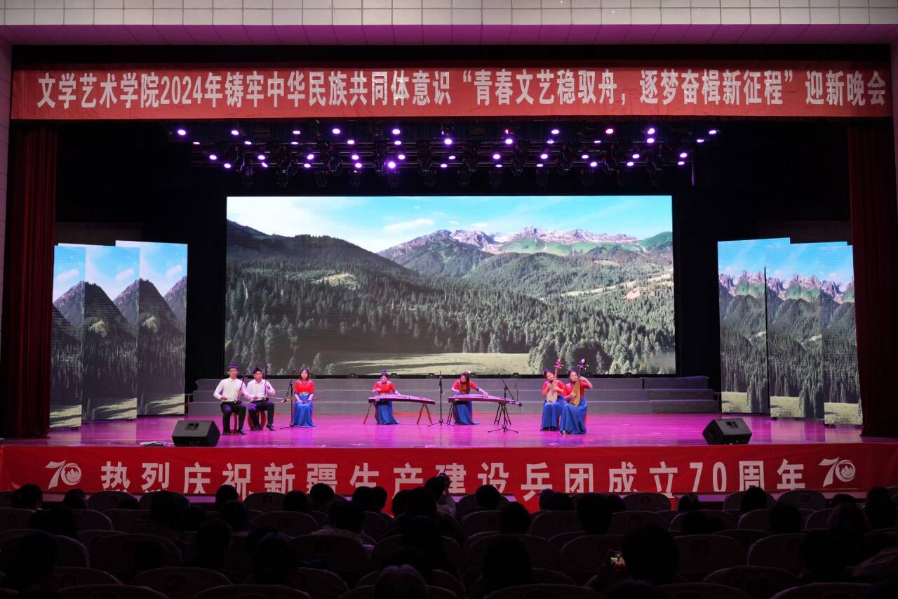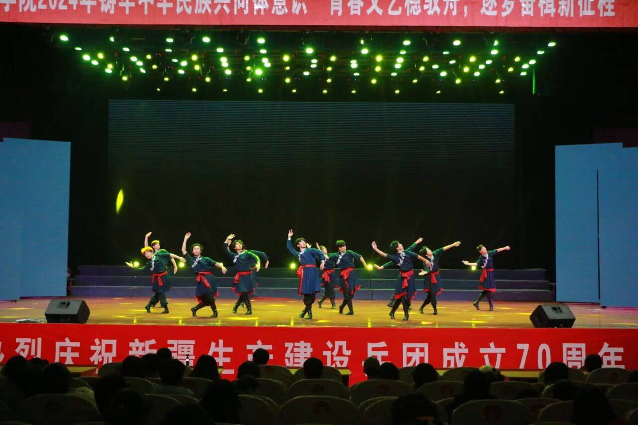 随着乐队倾情演绎的《西湖》、《霓虹甜心》,现场气氛瞬间被点燃,迎新晚会在师生的欢呼声中热烈开场。第一篇章“奋楫笃行共谱华章”舞蹈《娜孜碧柯》以优美的舞姿,灵动的步伐,展现着独特的异域风情与文化;民乐合奏《锦绣韶华》,让人仿佛置身于江南水乡的亭台楼阁之间,品味着琵琶与三弦合奏的无穷魅力。歌曲《我是一条小河》在歌者的深情演绎下,每一句歌词都化作一束光芒,照亮我们前行的道路;朗诵者以激昂的语调朗诵的《永远的兵团》,诉说了兵团的故事,让在场观众深刻感受到那份坚韧不拔、勇往直前的精神力量。