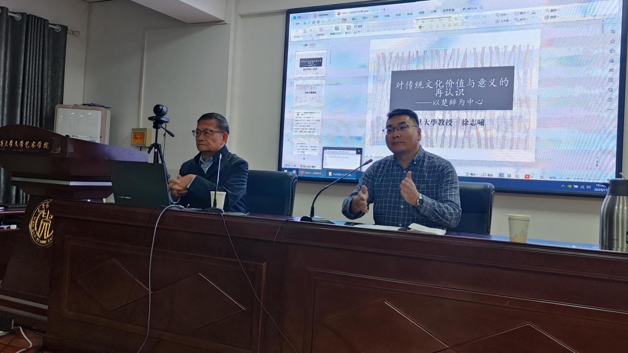 2024118学院邀请复旦大学中文系的徐志啸教授,举办了主题对传统文化价值与意义的再认识——以楚辞为中心的学术讲座。此次活动吸引了众多师生的关注,现场座无虚席,气氛热烈讲座由郭中华老师主持。