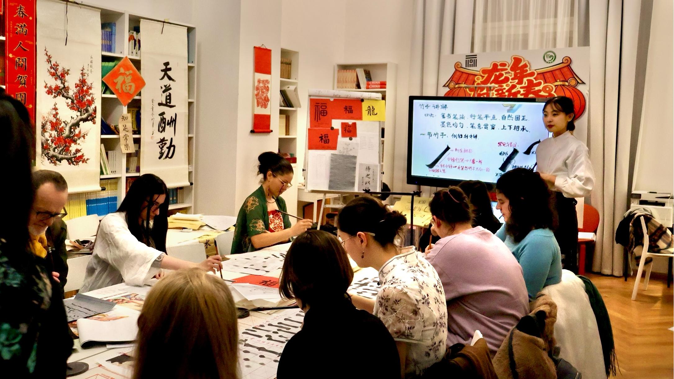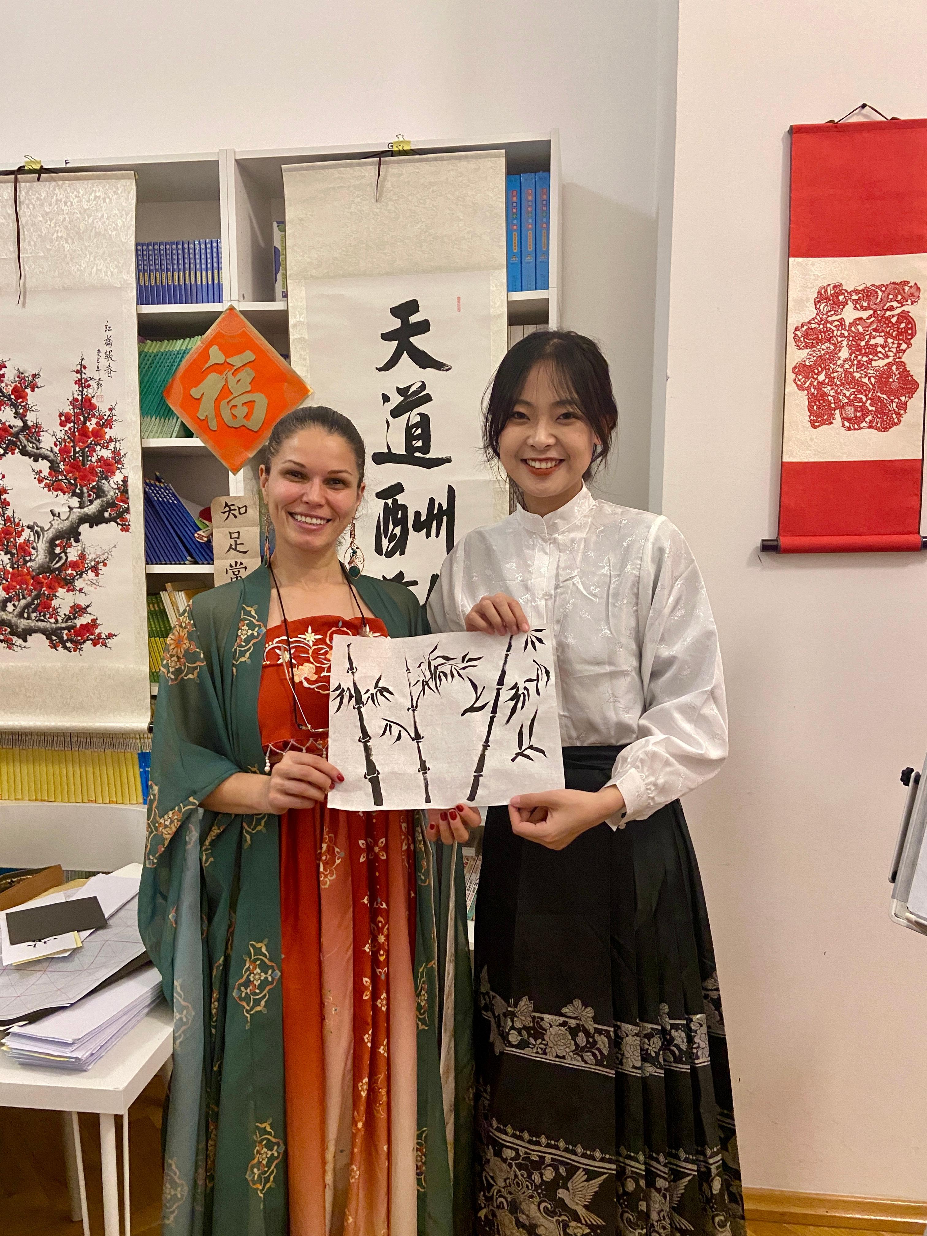与此同时,茶艺展示环节也吸引了众多目光,学生们不仅观看了传统茶道的表演,还亲自品尝了多种中国茗茶。在笔墨与茶香交织的氛围中,大家深刻感受到了中华文化的博大精深。
