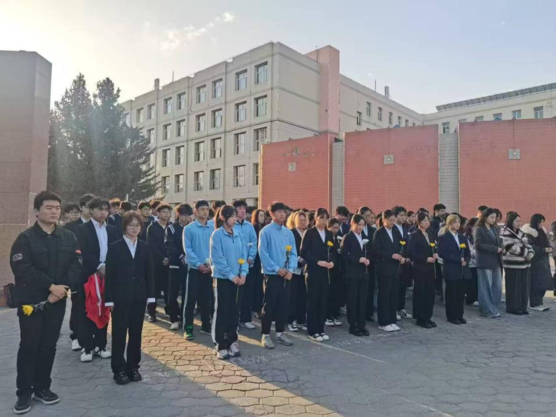 全体师生默哀一分钟,现场庄严肃穆。默哀结束后,师生代表依次敬献白菊,寄托哀思。学院王嘉莹老师勉励青年学子铭记历史、传承精神,勇担新时代使命。在体育学院余龙老师带领下,全体师生重温入团誓词,展现继承遗志、矢志奋斗的信念。