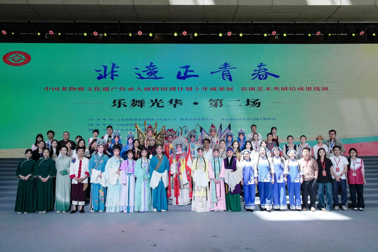 本次展览开幕式后,由我校非遗团队与中国非遗馆社会服务部共同策划组织实施的“乐舞光华”——“中国非物质文化遗产传承人研修培训计划十年成果展·表演艺术类非遗研培成果选演”四场现场展演分别于2025614日上午下午、615日上午下午在中国非物质文化遗产馆中央大厅隆重上演。beat365官网音乐与舞蹈系张弫副教授担任四场演出现场导演,beat365官网音乐与舞蹈系向虹颖担任演出主持人。来自全国21所院校推荐的31个研培节目给现场参观者带来表演艺术类非遗的独特魅力和无限震撼。共有2位国家级非遗代表性传承人、2位中国戏剧梅花奖获得者、6位省级非遗代表性传承人、几十位市县级非遗代表性传承人参与演出;他们让观众体悟到传统表演艺术与现代艺术审美的碰撞,让我们见证了十年非遗研培过程中院校守正创新保护非遗的更多可能性。