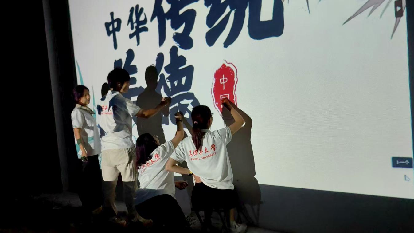 当夜幕降临,灯光成为新的“画笔”。志愿者们手持细笔,借着柔和的光线专注勾线:用流畅的线条勾勒出人物的神情,让“学”中孩童的求知姿态更显生动;以利落的笔触刻画场景细节,让“勇”里的骏马山路更具质感。夜晚的宁静为创作提供了专注的氛围,精准的线条让白天的色彩有了更清晰的轮廓,使每一则美德故事都愈发鲜活可感。