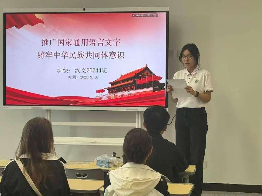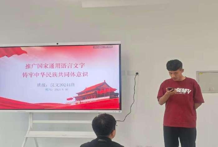 9月16日下午,在学院、中文系的号召下,汉文2024级4班举行了第28届全国推广普通话宣传周宣传动员活动。本次活动以"加大国家通用语言文字推广力度,促进铸牢中华民族共同体意识"为主题,不同民族、不同年级的同学们共聚一堂,并特别邀请了来自哈萨克斯坦、阿富汗、缅甸的留学生共同参与。
