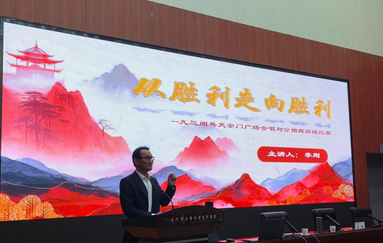 基于国庆60周年、70周年盛典等国家重大庆典活动中大型合唱与分指挥训练总指挥的经验,李刚教授从八个核心维度展开了深入分享。他首先梳理了抗战历史的脉络,借助一分多钟的短视频直观再现那段艰苦卓绝的峥嵘岁月,深入解读抗战精神的内涵,深情缅怀赵一曼、杨靖宇、赵尚志等英雄先辈,阐释“钢铁般的意志”这一精神内核,并将其与石河子军垦精神相联系,明确音乐教育者的时代职责与使命。同时,他系统剖析了抗日战争胜利的伟大意义与阅兵活动的历史价值,助力现场师生深刻领会历史与庆典的深层关联。