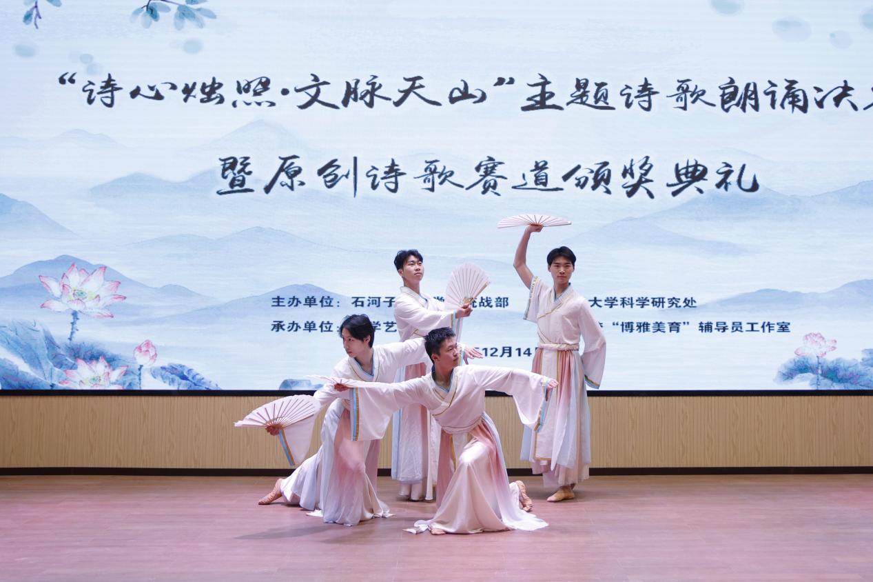 决赛现场,选手们以声传情,深情演绎了一系列跨越时空的经典作品,从《岳阳楼记》《将进酒》的磅礴气势到《祖国啊,我亲爱的祖国》《年轻的城》的赤子情怀,从集体朗诵《新疆,向世界敞开胸怀》的地域豪情到多民族合诵《我在一颗石榴里看见我的祖国》的团结深情,每一段表演都深深感染着在场观众;音乐系学子的声乐独唱《天山醉明月》更以动人旋律将现场气氛推向高潮。经过专业评审,活动最终评选出各级奖项,在颁奖仪式上对表现卓越的学子予以表彰,并向所有参赛选手赠送了本次活动的原创入围作品诗集